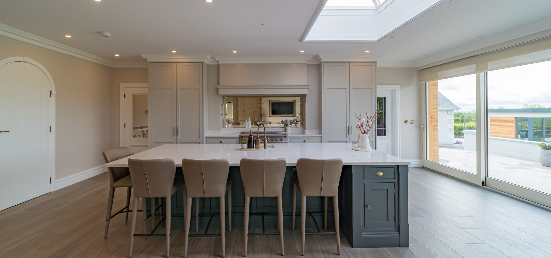 A Rangemaster Professional cooker sits confidently at the heart of this kitchen, bringing a strong, timeless presence to the space. Its stainless steel finish provides a striking contrast against the soft, painted cabinetry, creating a perfect balance between classic design and professional performance.