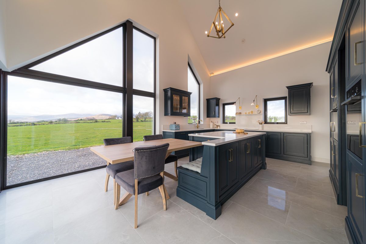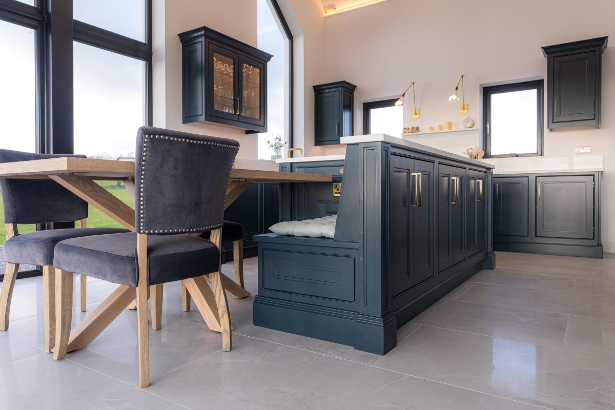 Light quartz worktops provide a crisp contrast to the cabinetry, while the warmth of the solid timber dining table introduces a natural, tactile element that makes the space feel welcoming and lived in.