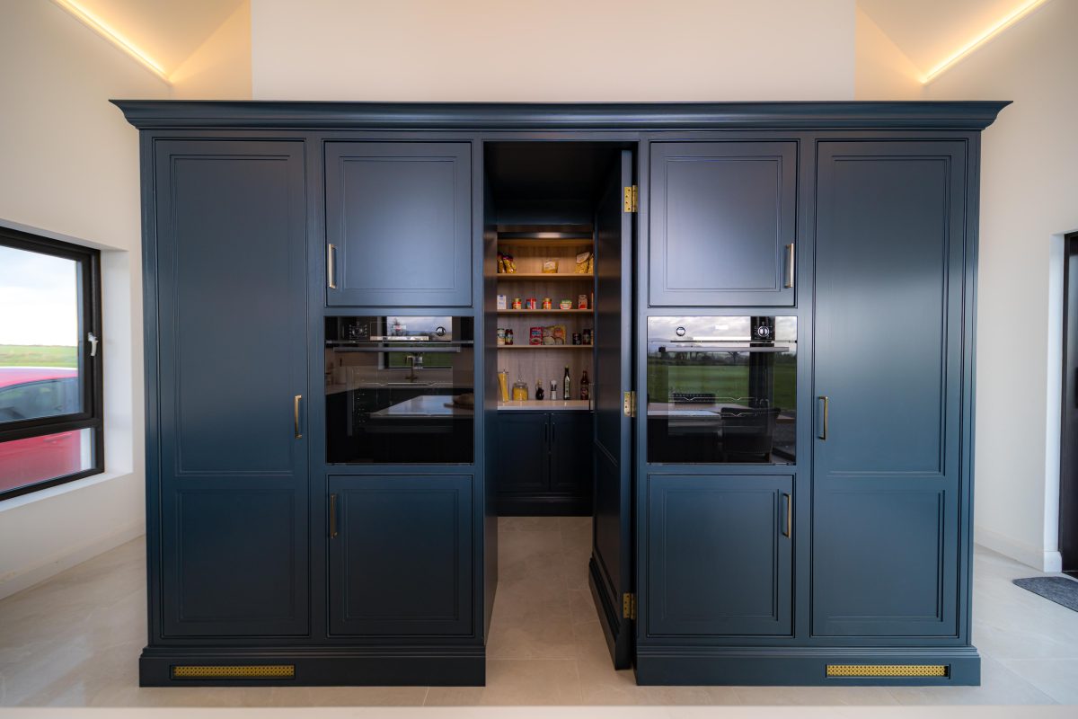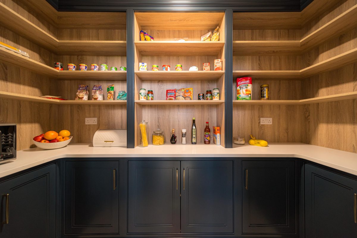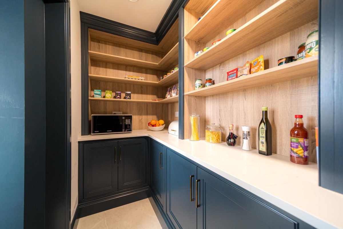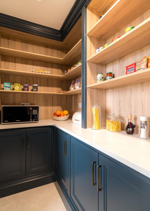 Once opened, the room transforms into a warm and practical storage area. Internally, natural timber shelving wraps the walls, bringing contrast to the deep painted cabinetry and creating a softer, more tactile working environment. Generous worktop space allows for small appliances to be housed neatly out of sight, keeping the main kitchen calm and uncluttered.