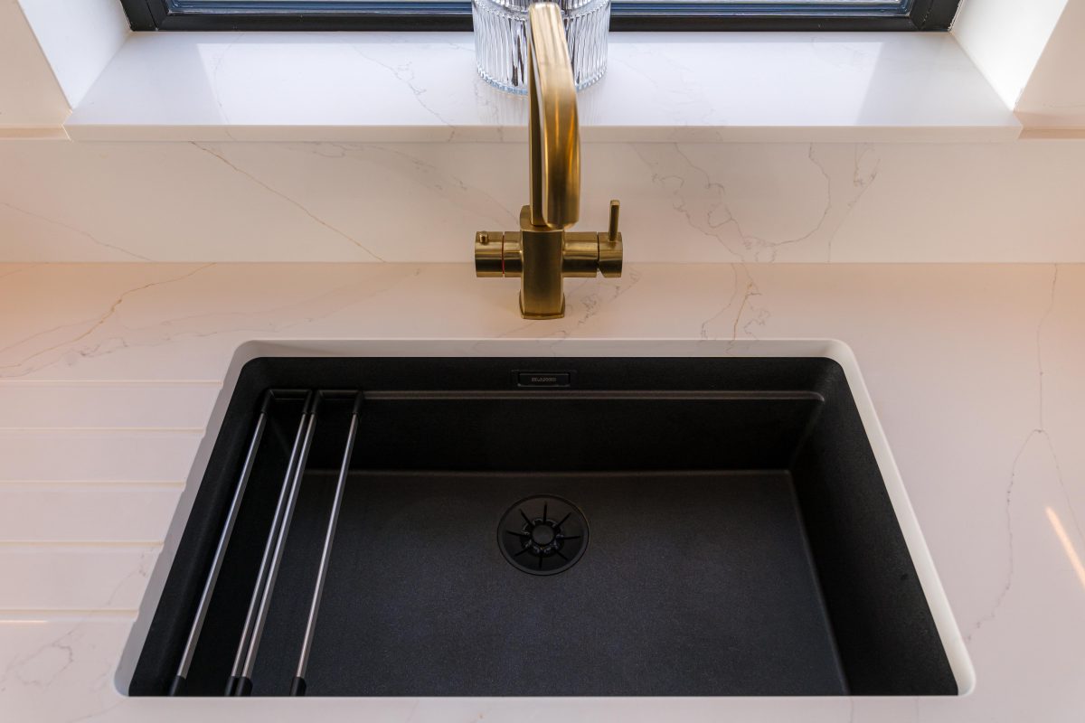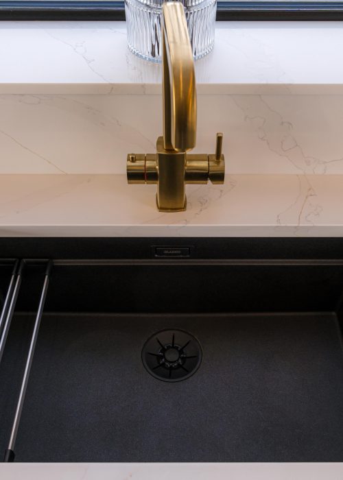 The prep area is centred around a striking undermounted black sink, paired with a satin brass tap for a warm contrast against the light quartz worktop. Clean, simple and highly functional, this combination creates a dedicated workspace while echoing the material palette used throughout the kitchen.