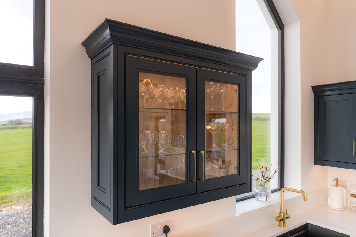 Painted to match the surrounding cabinetry and finished with antique-effect glass, it provides a softly lit display space while maintaining the strong architectural lines of the kitchen. Positioned beside the window, it brings both balance and a sense of quiet elegance to this corner of the room.
