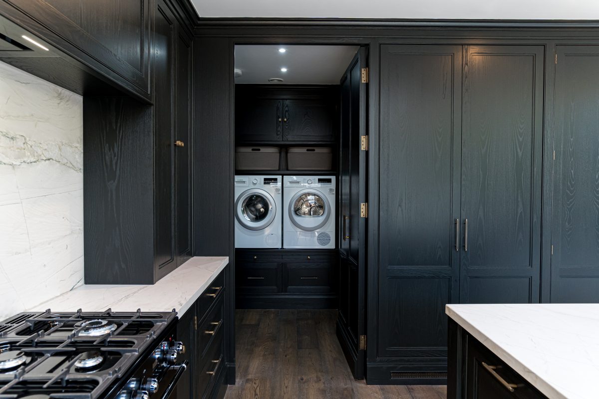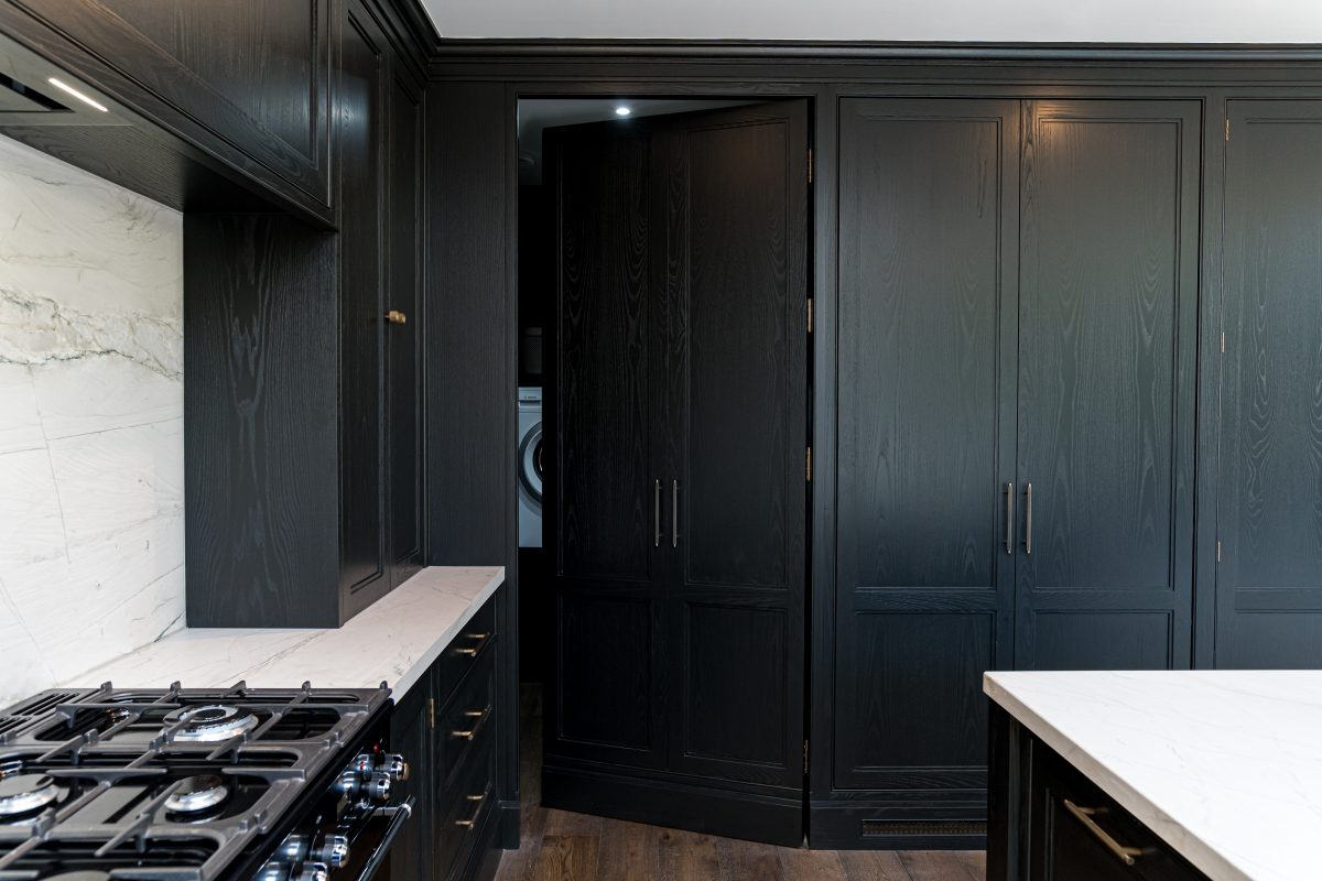 Just when you think you’ve discovered every detail in our Obsidian Kitchen Dublin, a secret door reveals a hidden utility room, painted also in Paint & Paper Library “New Black.”