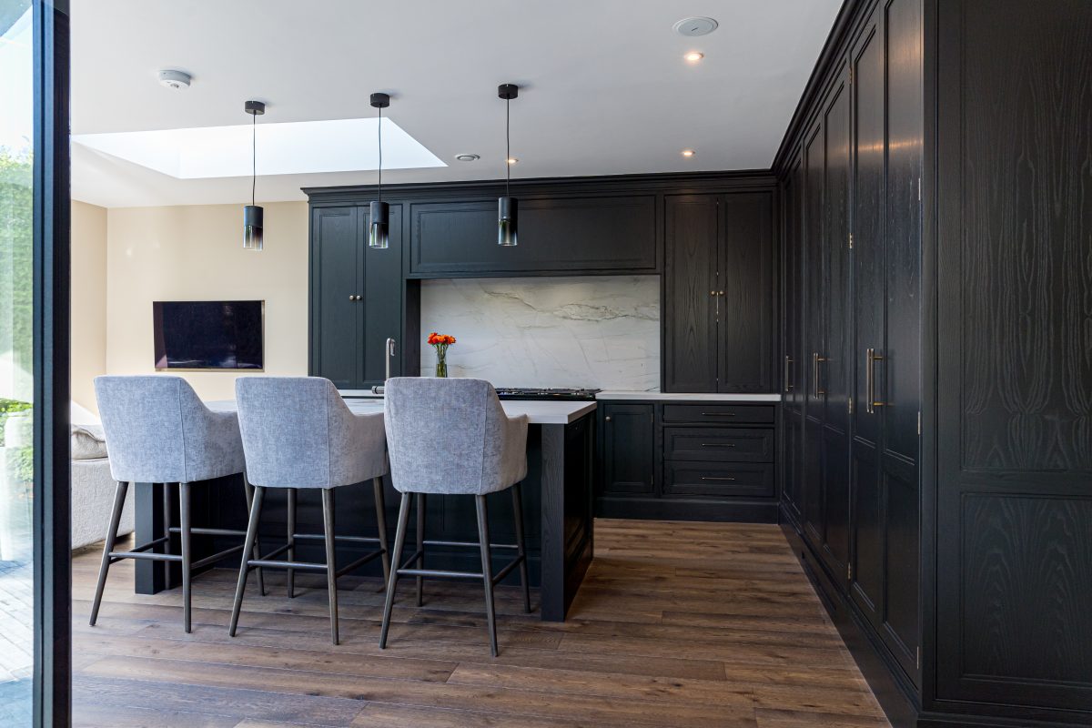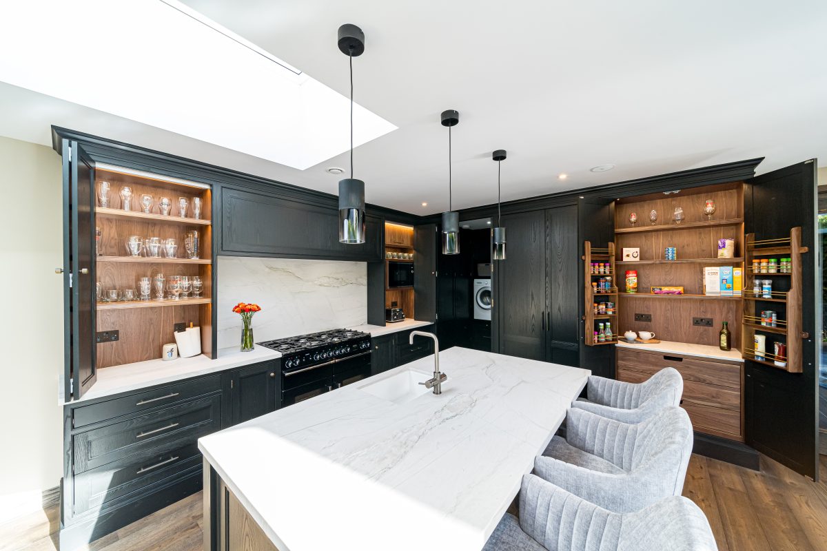 The twin bi-fold cabinets flanking the over mantle in our Obsidian Kitchen Dublin offer smart, functional storage, keeping work surfaces clutter free while ensuring the space remains fully usable. Crafted from solid ash and finished in Paint & Paper Library’s “New Black,” each cabinet reveals a beautifully lacquered walnut veneered interior that adds depth and warmth.