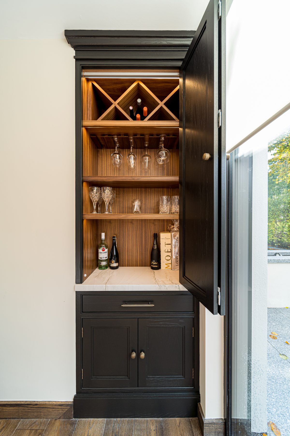 We have also pictured here a snapshot of the Obsidian Kitchen Dublin drinks cabinet, finished in New Black with a striking solid walnut interior.