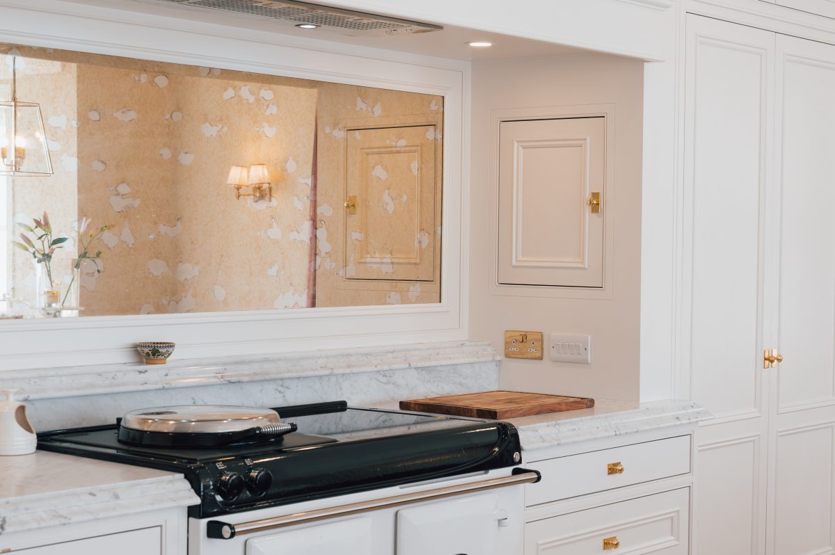 The antique mirror splashback introduces a soft, reflective quality, enhancing natural light and adding depth behind the range. Its aged finish brings subtle character to the space, gently diffusing reflections while maintaining a warm, elegant atmosphere.