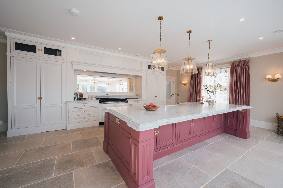 Generous in scale, the island provides ample workspace while also accommodating everyday use, from food preparation to informal dining. The subtle detailing of the in-frame panels, combined with the crisp stone worktop, reinforces the kitchen’s classic proportions while maintaining a clean, contemporary feel.
