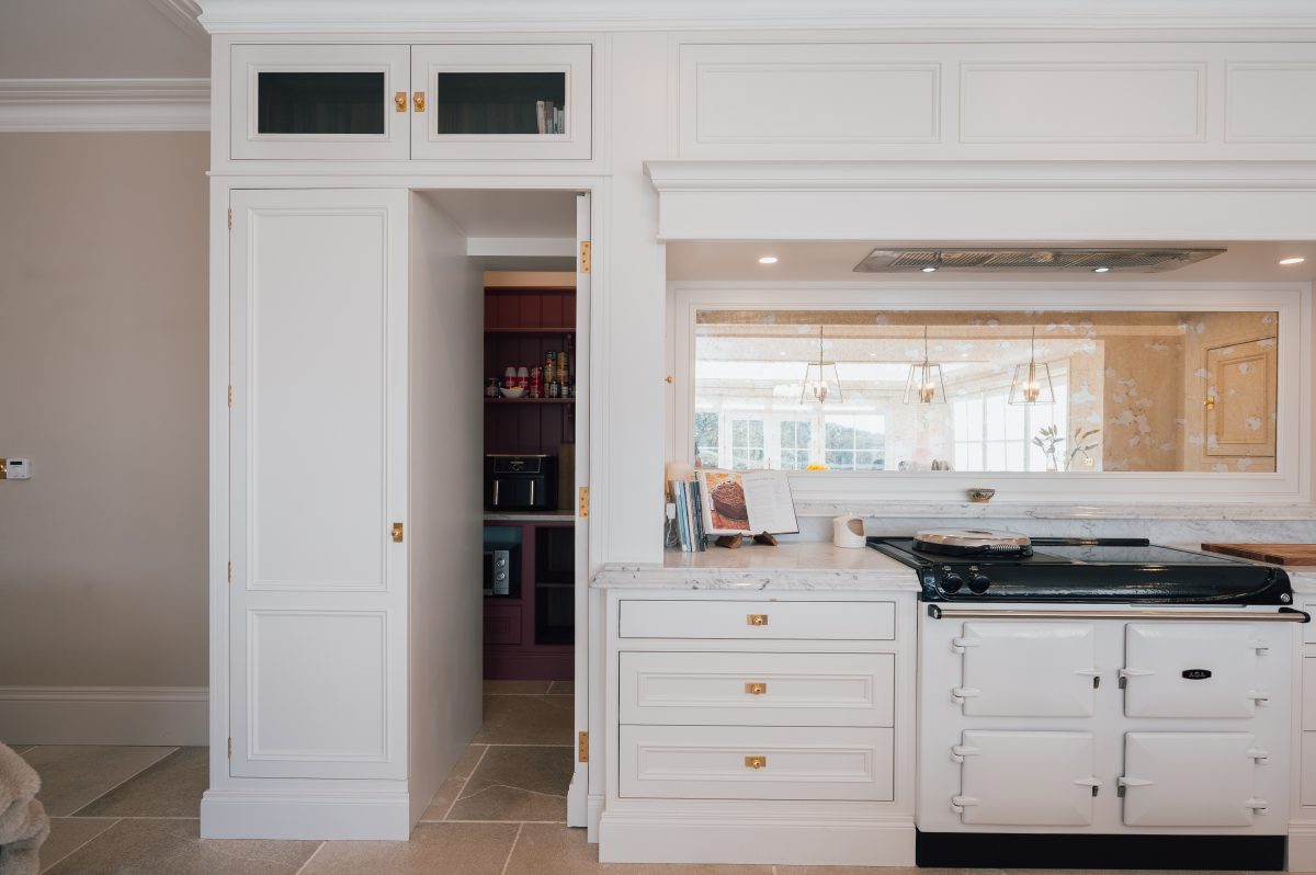 A standout feature of this kitchen lies within the tall cabinetry. Seamlessly integrated into the design, these full-height doors conceal a hidden entrance to the pantry beyond, an example of how craftsmanship and clever design can elevate both form and function. This concealed access maintains the clean symmetry of the kitchen while providing practical, discreet storage.