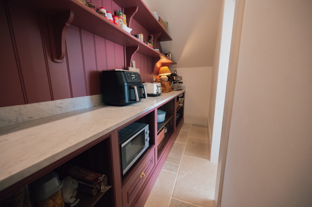The concealed pantry, finished also painted in pink chocolate, continues the design language of the main kitchen while adding depth and warmth to the space. Hidden behind the tall cabinetry, it offers a practical yet beautifully integrated storage solution that enhances both function and flow.