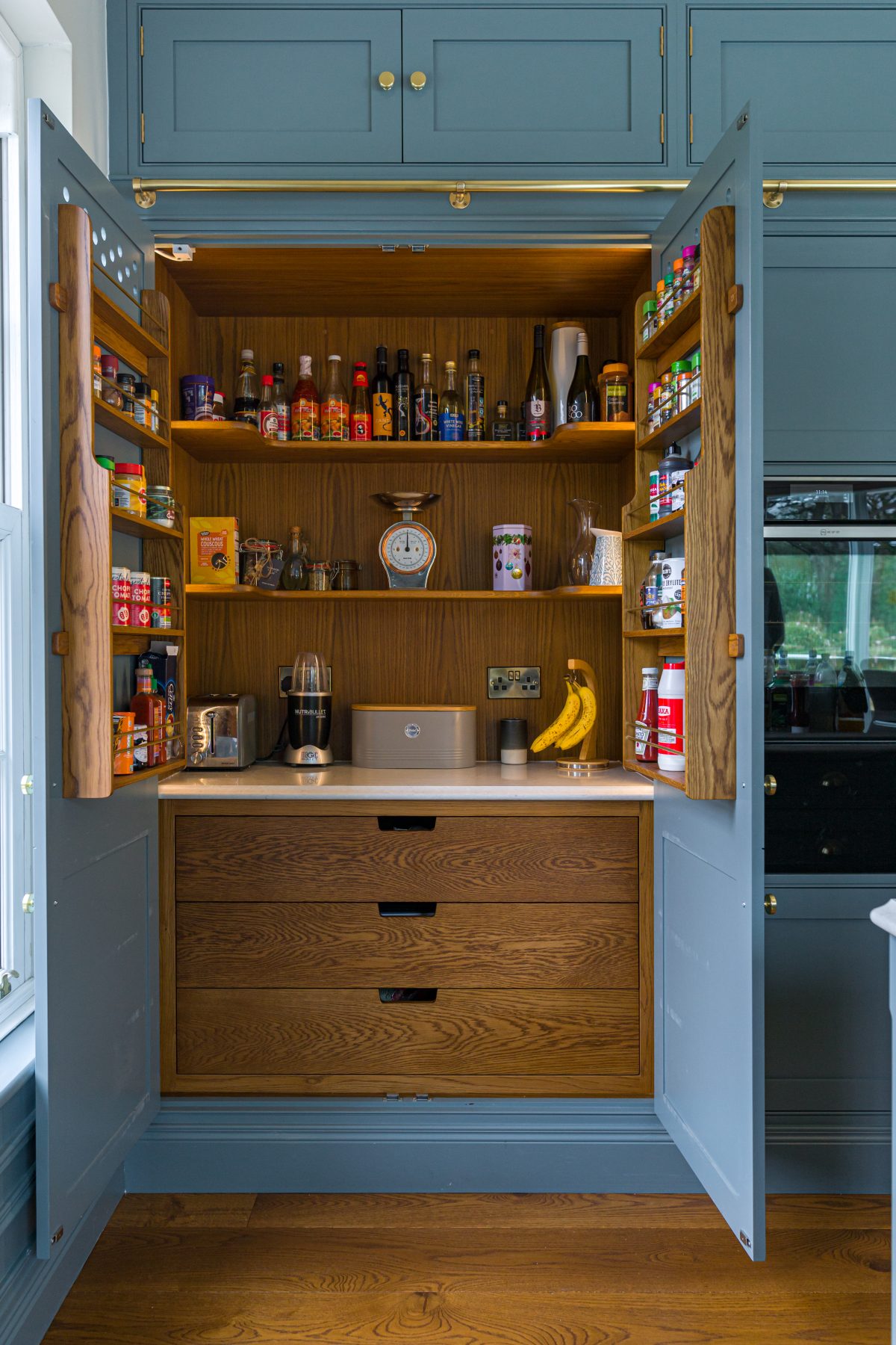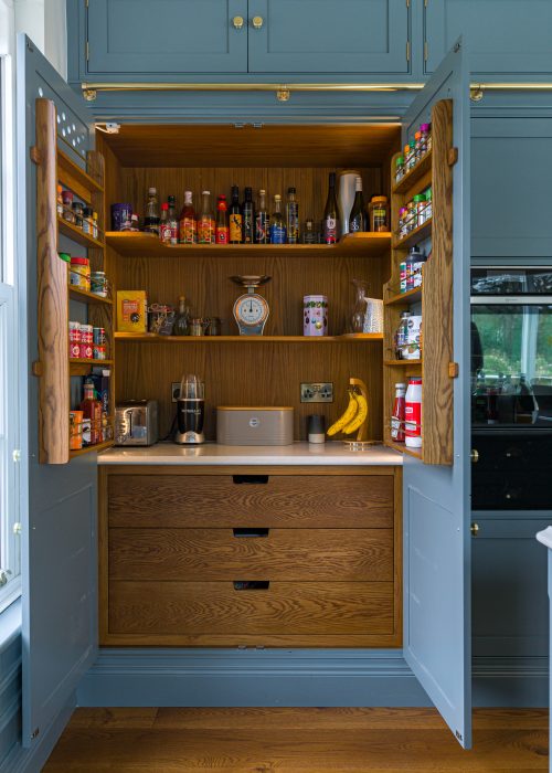 You know your kitchen is truly bespoke when the interior of your pantry is crafted to complement your wide board Oak flooring.
