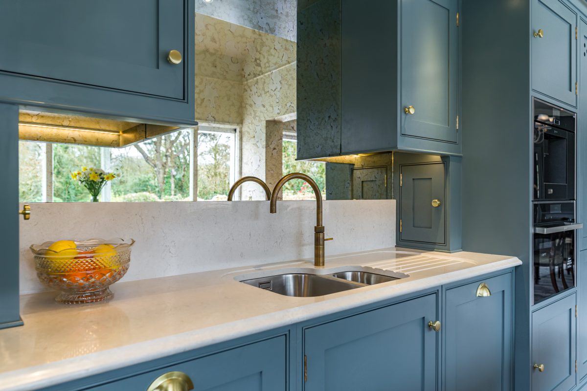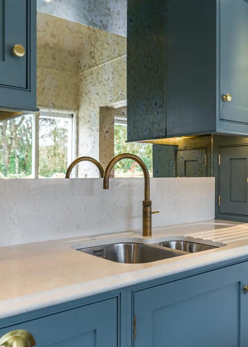 Our Norbury kitchen offers a refined alternative, with the wash area centrally positioned within a beautifully balanced run of tall cabinetry. A quartz splashback and antique mirror add depth and subtle reflection, enhancing both light and texture.