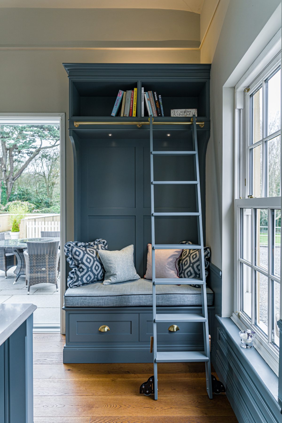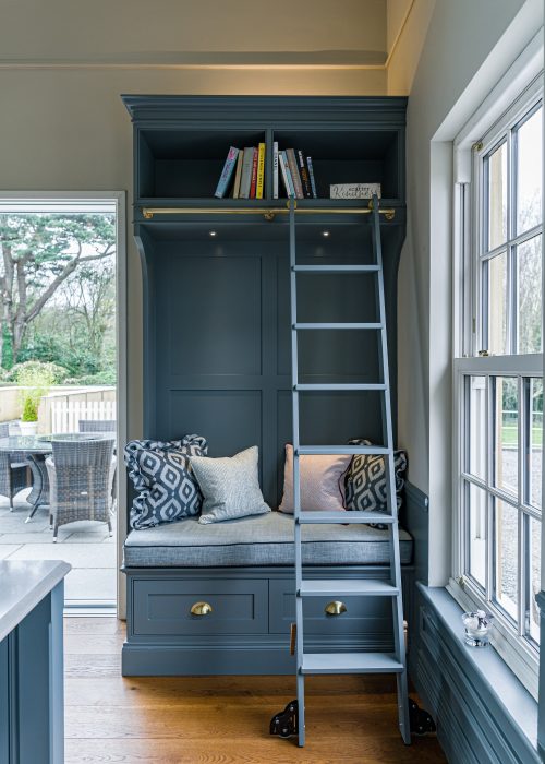 Framed by bespoke cabinetry and finished in the same rich hand-painted tone as the kitchen, the built-in bench offers generous storage below and open shelving above for treasured books and personal pieces. The addition of a classic library ladder brings both charm and practicality, allowing easy access to the upper shelves while adding a beautiful architectural feature.