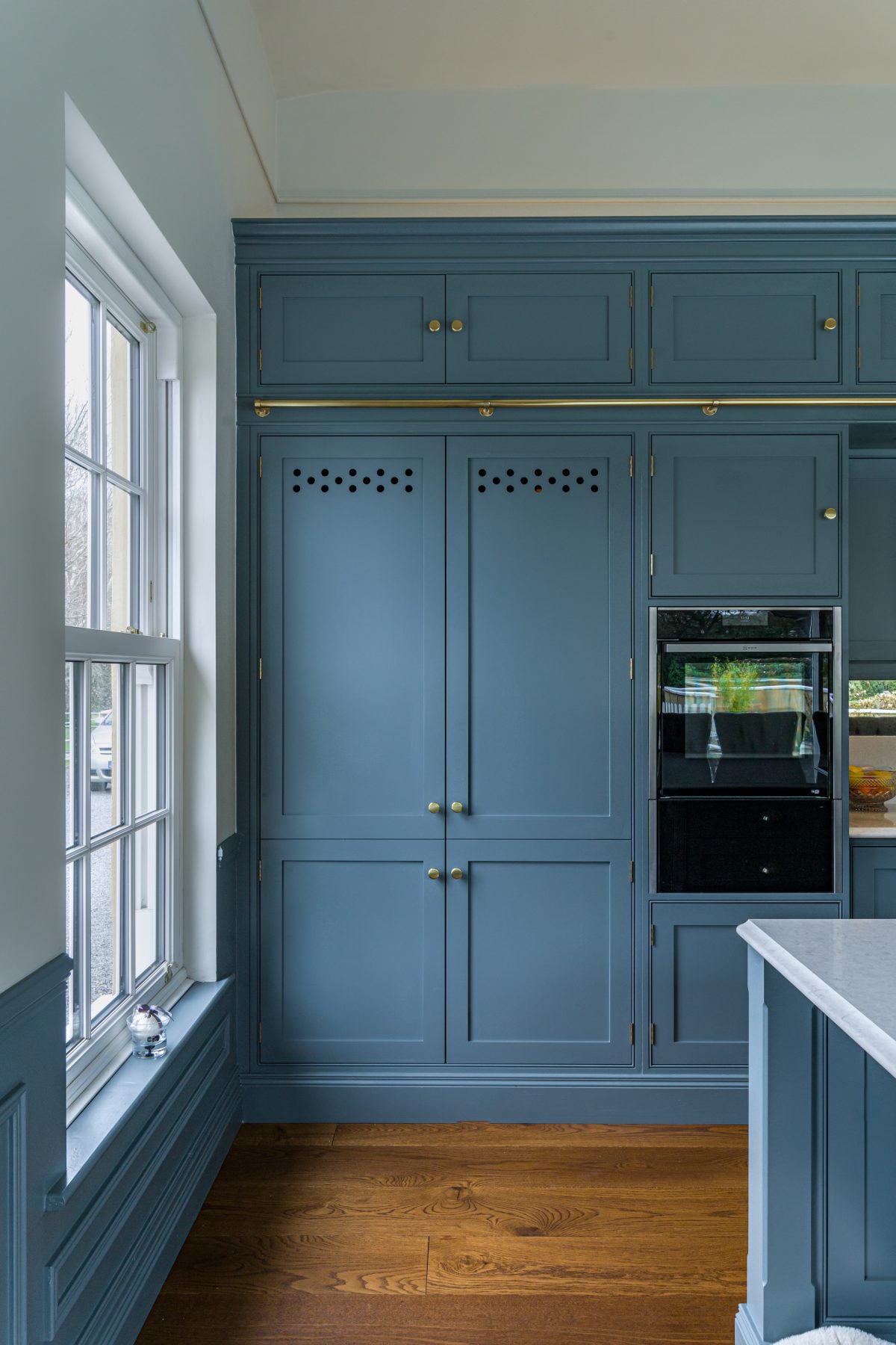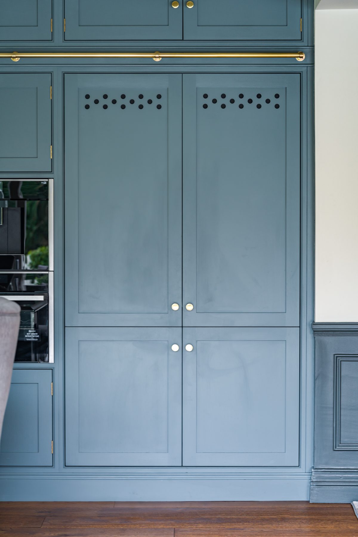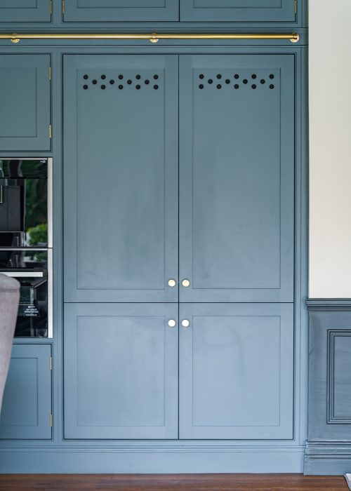 Flanking the space, double-door cabinetry discreetly conceals the fridge freezer, complete with bespoke crafted ventilation detailing integrated into the doors.