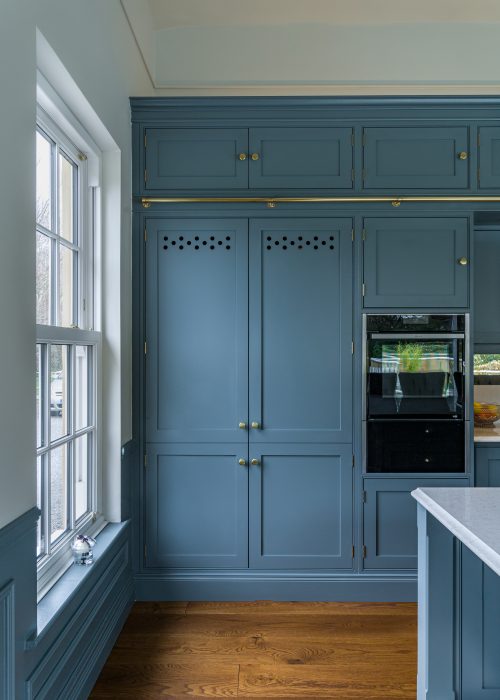 Balanced floor-to-ceiling cabinetry frames the central sink and window, creating a calm and harmonious focal point within the space. The soft hand painted blue finish is beautifully complemented by warm brass hardware and subtle detailing, bringing both elegance and warmth to the room.