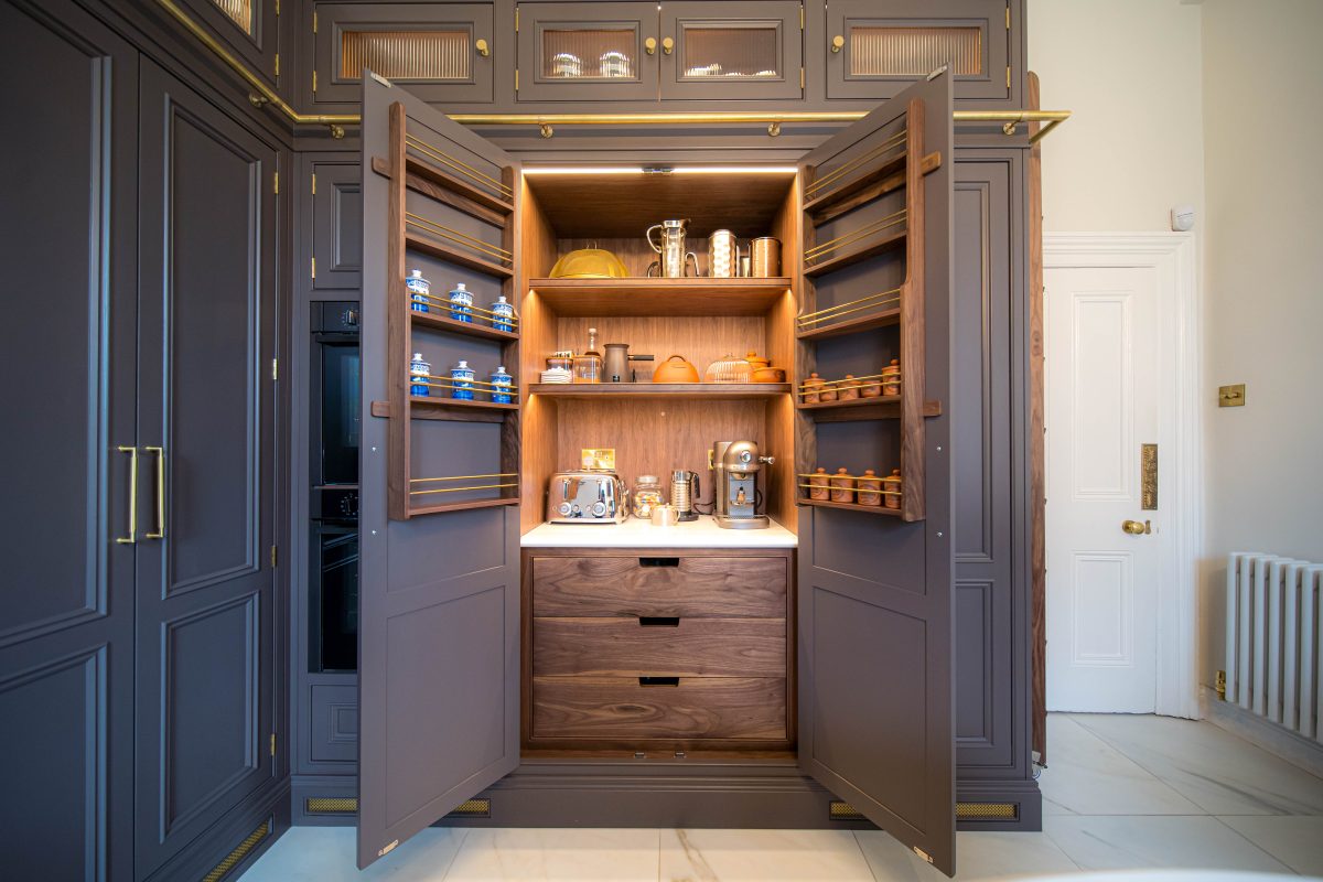 The bespoke in-frame cabinetry was designed and handcrafted to complement the home’s period proportions, with full-height storage, glazed display units, and detailed cornicing enhancing both practicality and elegance. The deep toned painted finish, paired with brass hardware, adds warmth and sophistication while reflecting the home’s heritage.