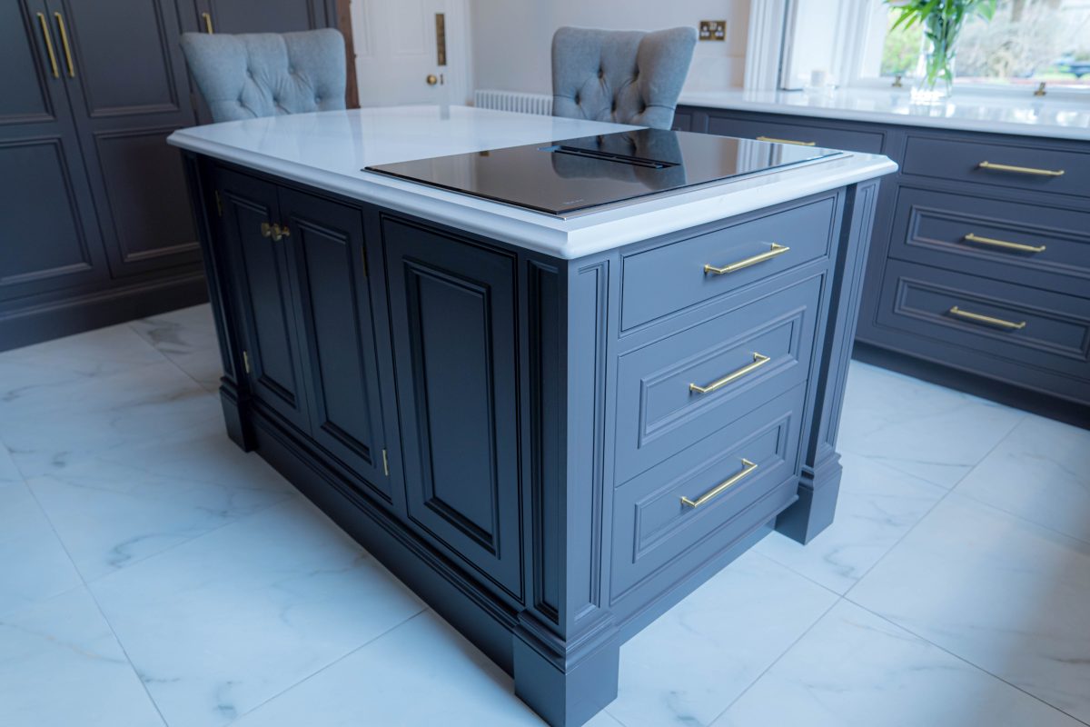 This petite island from our Tapeley project, measuring just 1m x 1.6m, proves that great design isn’t about size, it’s about thoughtful planning. Despite its compact footprint, it delivers all the functionality and detailing of our larger bespoke islands, including a discreet downdraft hob, comfortable seating, and cleverly integrated storage.