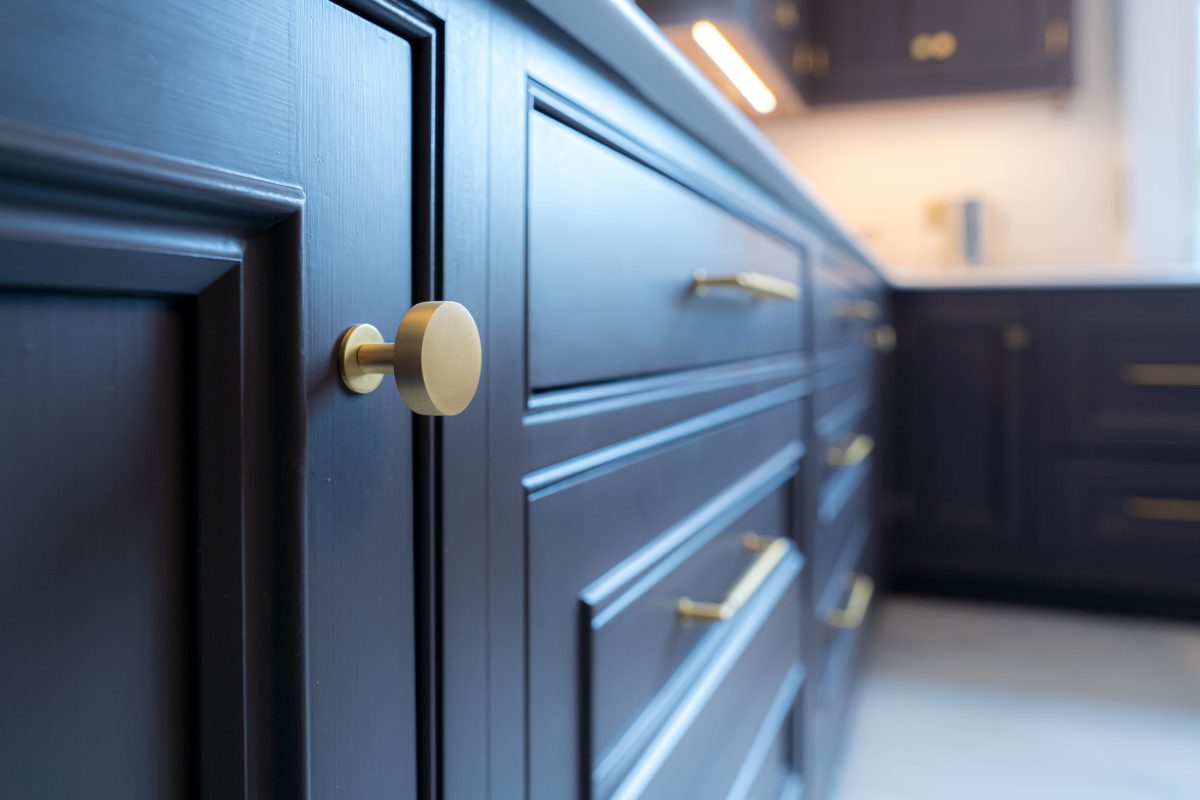 Satin brass trims bring the deep, dramatic tones of the Tapeley Kitchen project beautifully to life. The bespoke cabinetry is finished in Smokescreen by colourtrend paints, paired with walnut serving trays to introduce warmth and contrast.