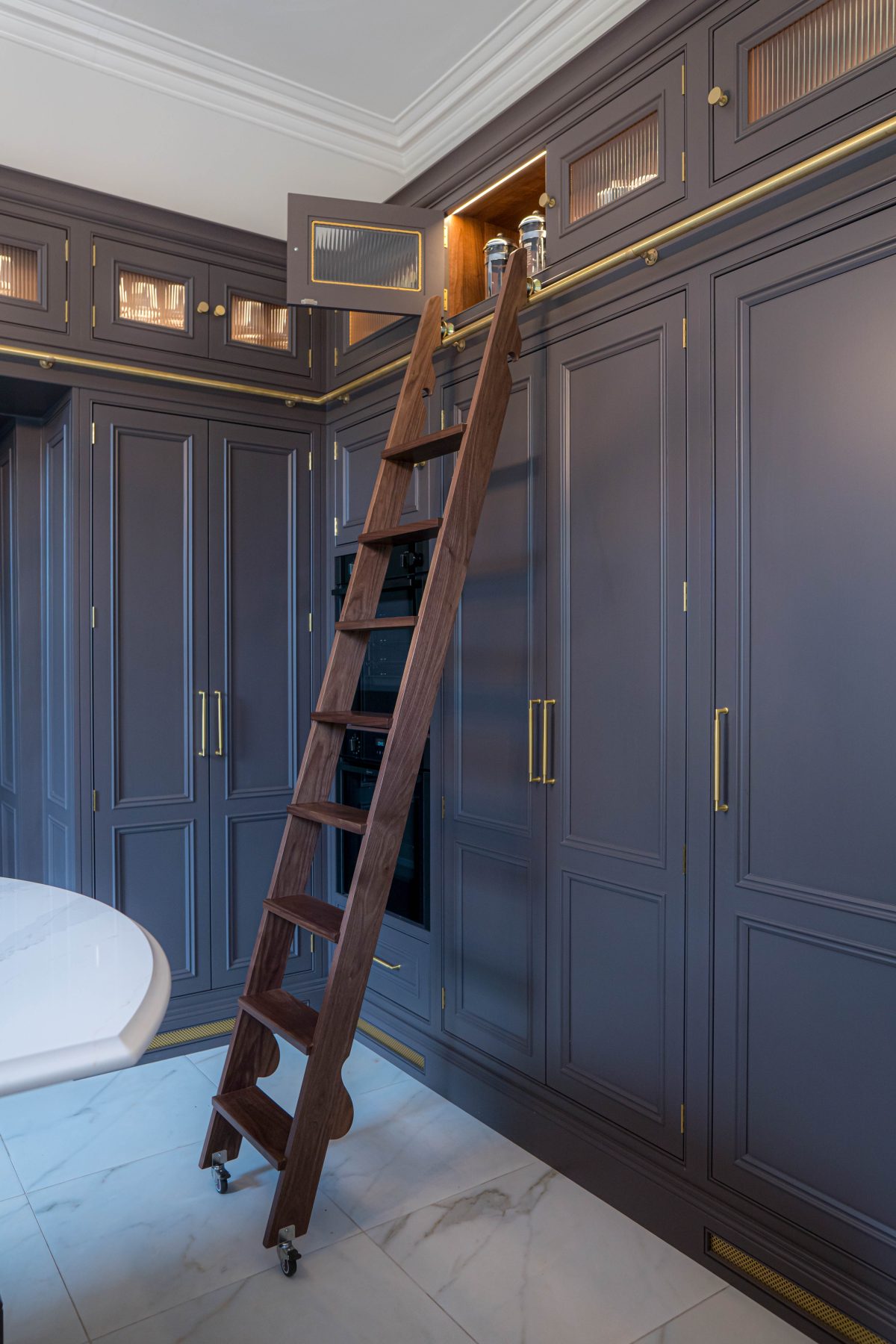 Crafted from solid walnut and finished to complement the surrounding joinery, the ladder introduces warmth and contrast against the deep-toned cabinetry, reinforcing the balance between traditional craftsmanship and modern usability that defines this Tapeley kitchen project.