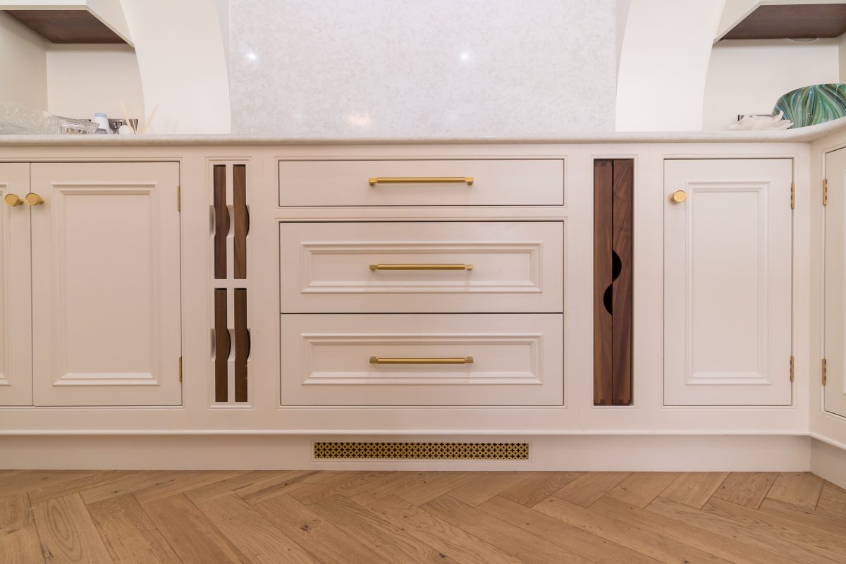 A standout feature of this project is the custom walnut serving trays and integrated chopping boards, expertly designed to sit within dedicated drawers. These handcrafted pieces not only enhance everyday practicality but also introduce a rich, natural warmth that beautifully complements the painted cabinetry and brass hardware.