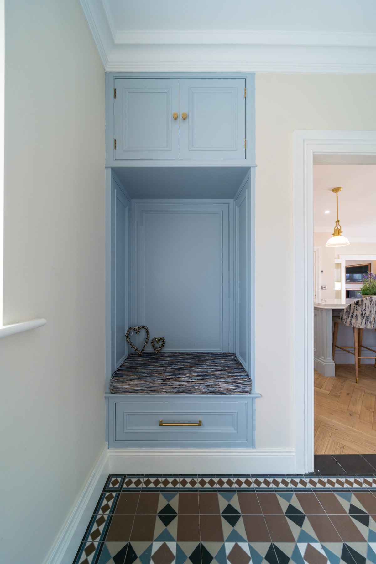 Featuring handcrafted in-frame cabinetry finished in a soft, calming tone, the space offers generous storage for household essentials while maintaining a clean and uncluttered feel. A dedicated bench and storage nook provide a practical area for boots, bags, and daily items, making the room as functional as it is welcoming.