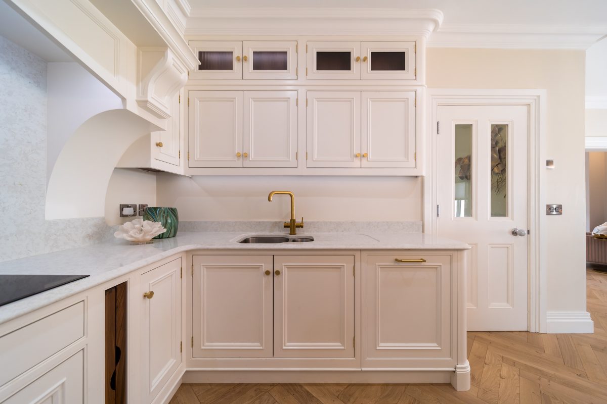 Every element of this kitchen has been carefully considered, from the elegant hand-painted in-frame cabinetry to the bespoke over-mantle, which adds architectural presence and a timeless focal point to the room.